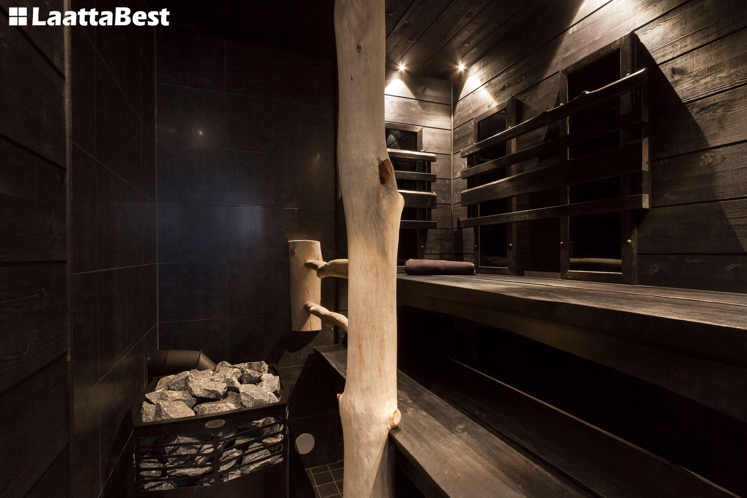 Kylpyosasto sekä kodinhoitohuone koki ison muutoksen. Saunassa sekä puukiuas että kotimaiset Duetto-infrapunapaneelit.