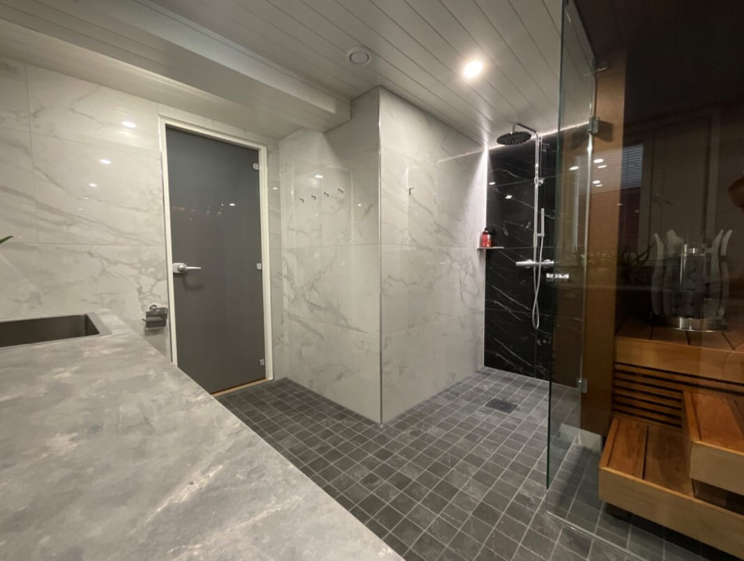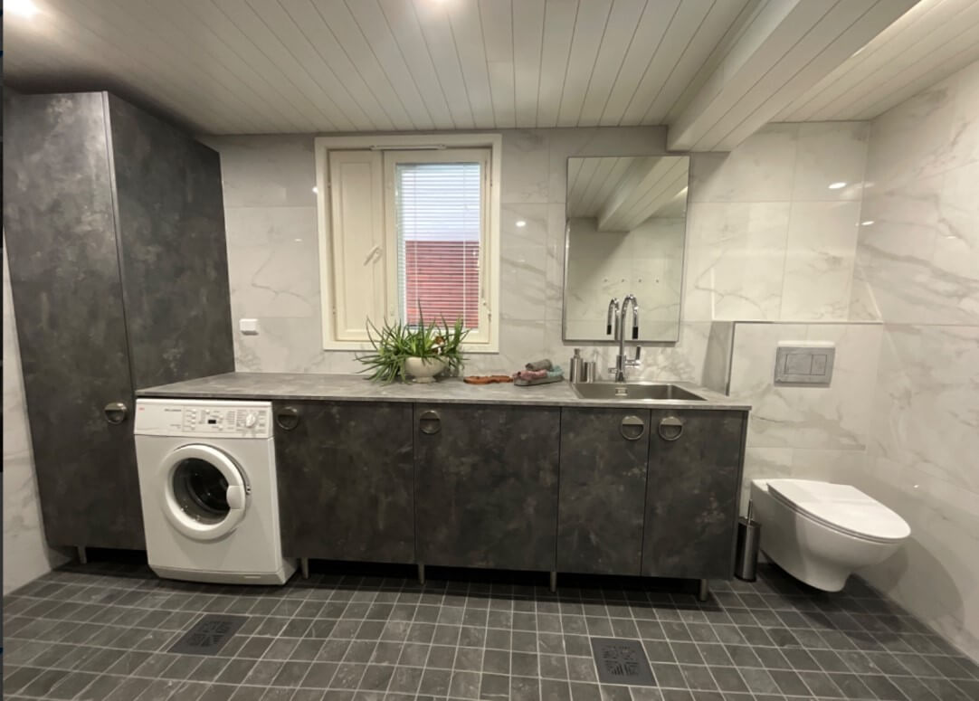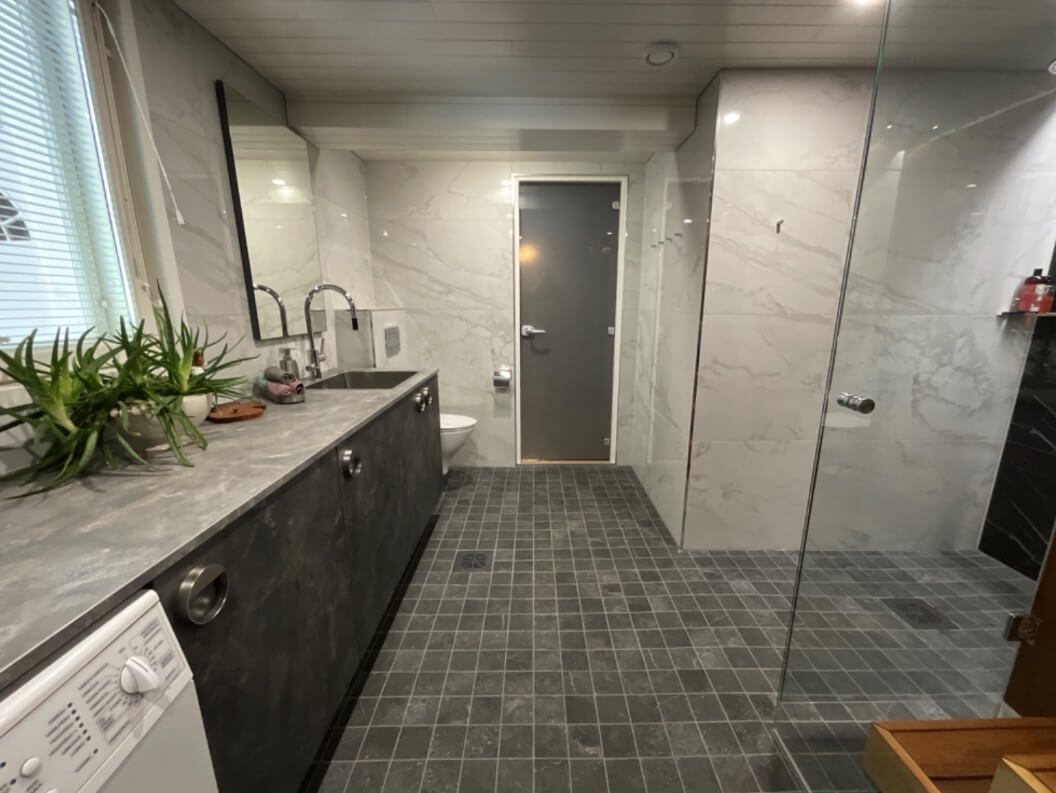 Tuusulassa, omakotitalon kylpyhuoneen ja saunan remontti. Laajensimme hieman tiloja ja WC-tilaan kulku yhdistettiin laajennukseen.