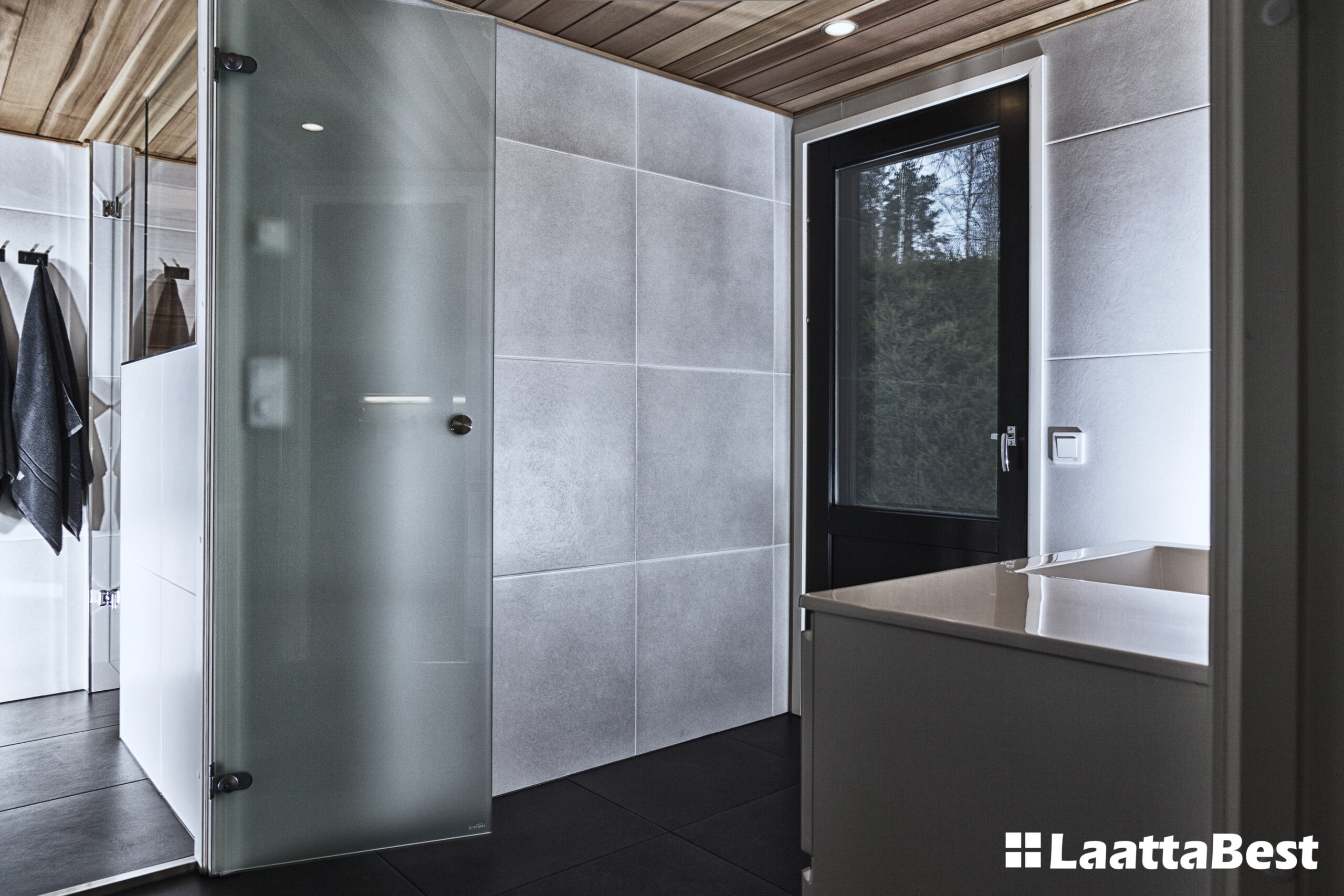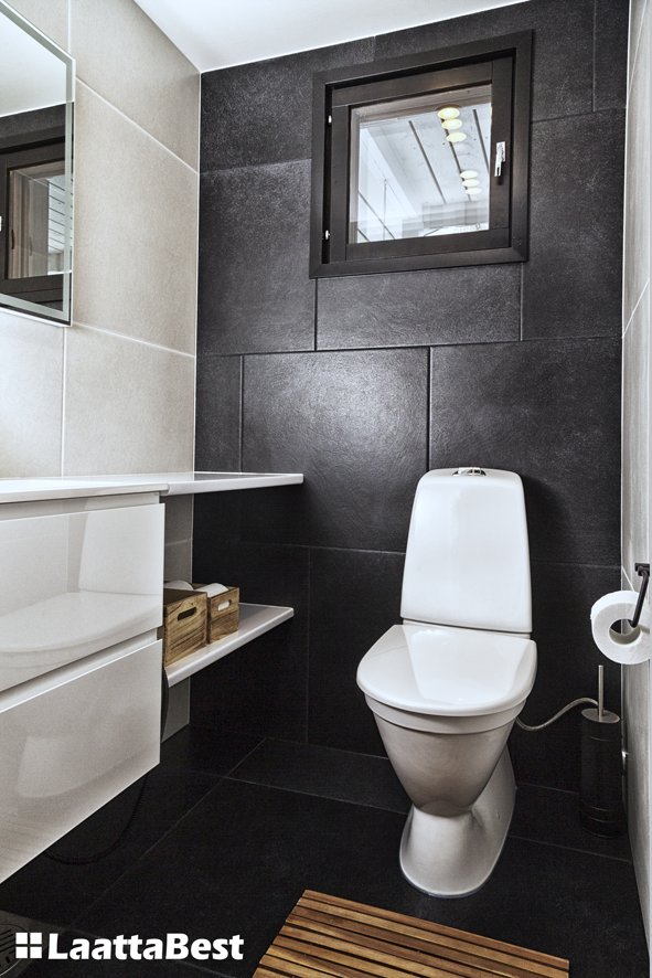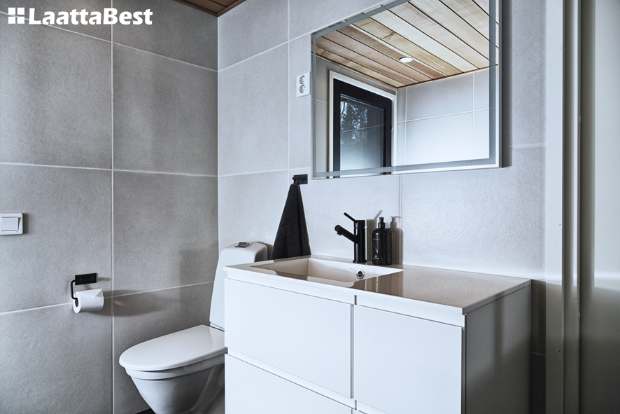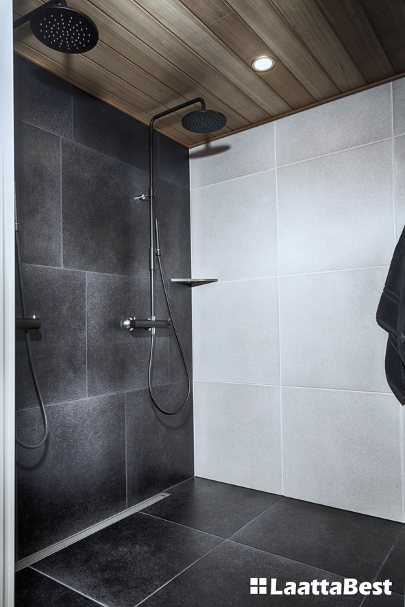 Upeat tilat. Suurtaa laattaa lattiassa ja seinissä. Seinäkaivo mahdollistaa suuren lattialaatan myös märkätiloihin.
