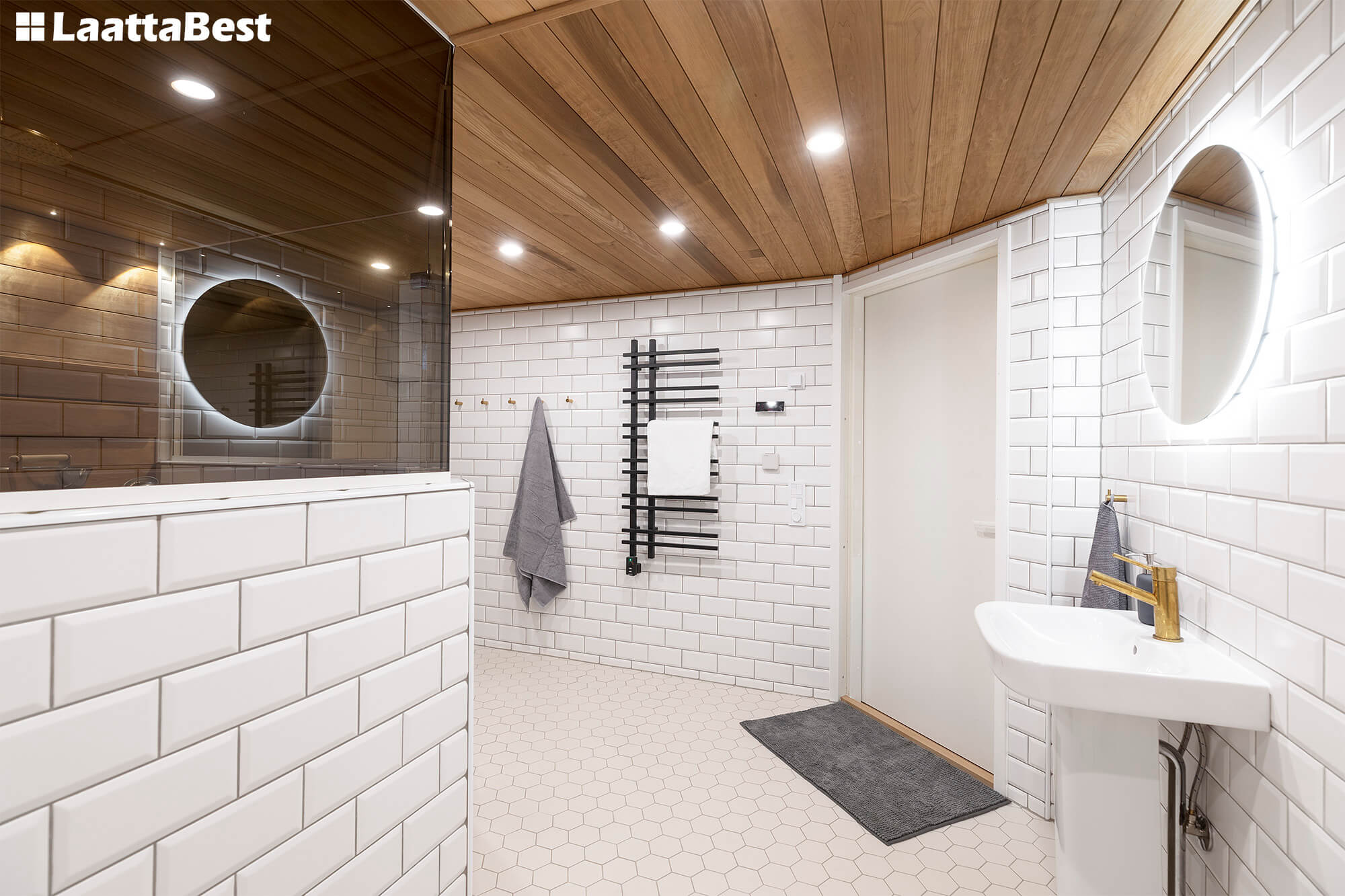 Alakerran tiloihin uusittiin sekä pesuhuone että sauna, Tuusulassa sijaitsevaan omakotitaloon. Hienoja yksityiskohtia.