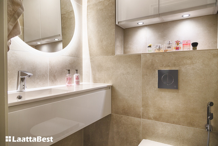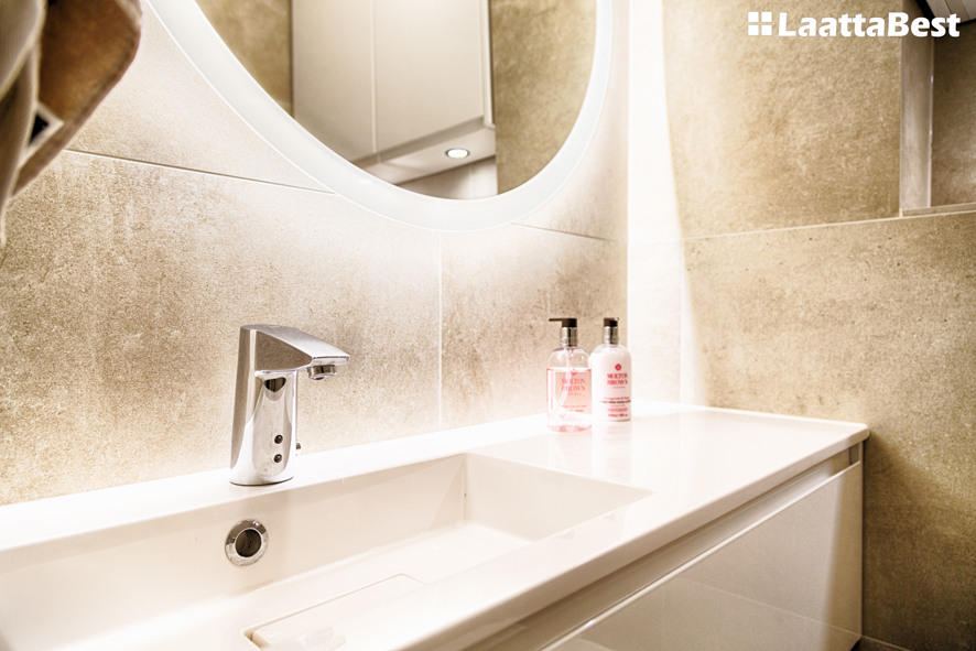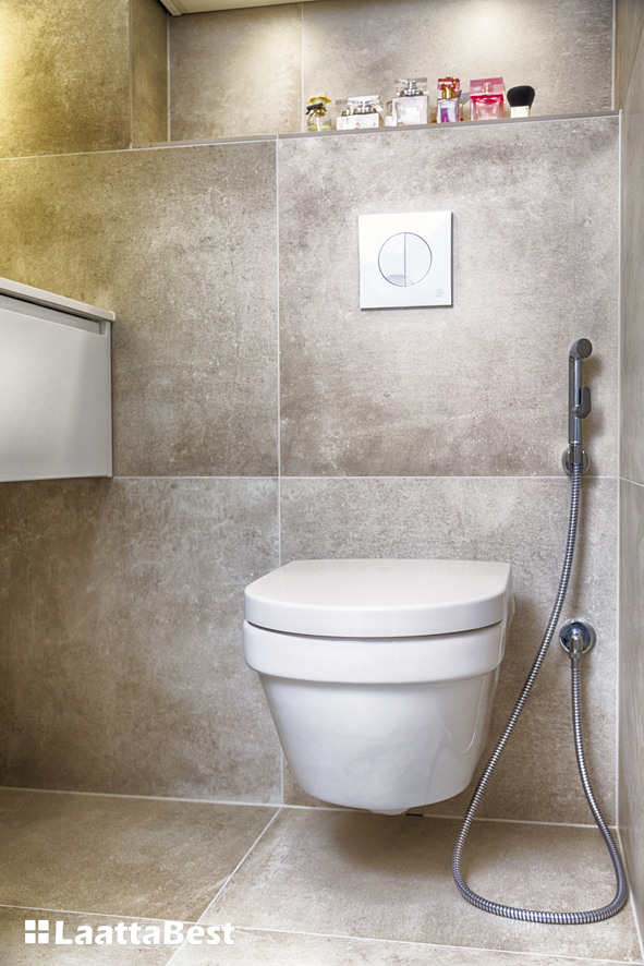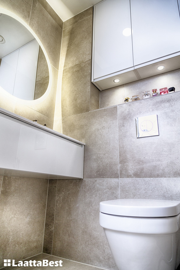Seinät ja lattia 60×60 laatalla. Flaviker Urban Concrete Beige.